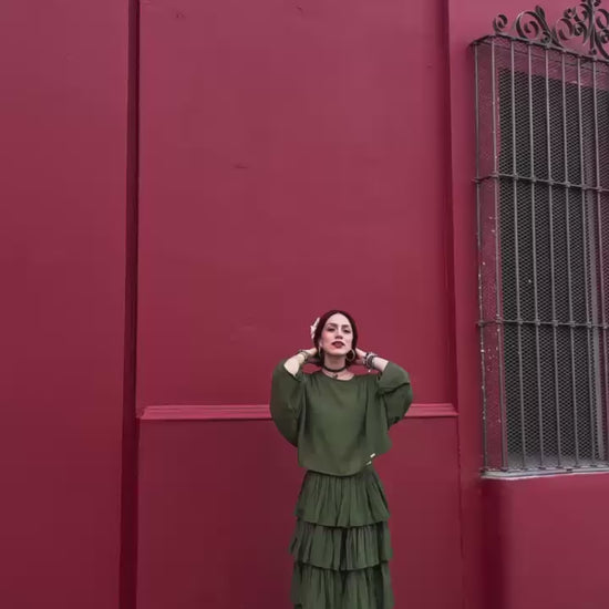 Blusa Emma unitalla y Falda larga 5 olanes Mediana Verde Olivo