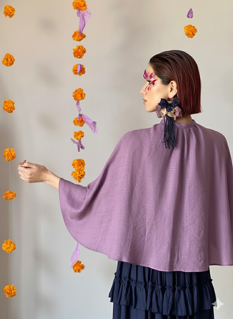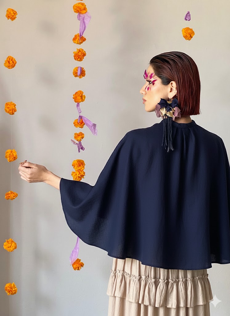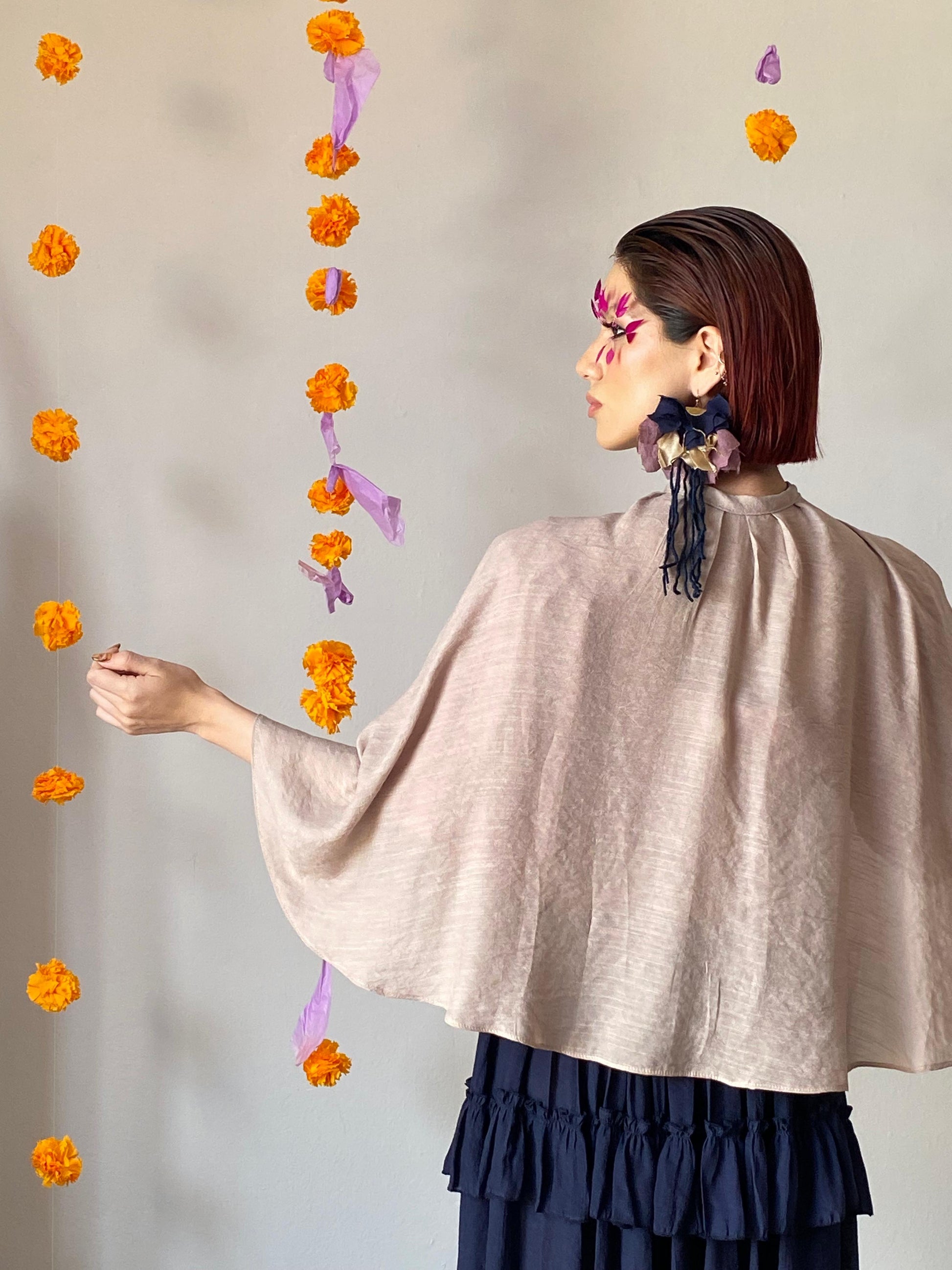 Capa circular de Tencel, cierra en cuello redondo con botón forrado y presilla.